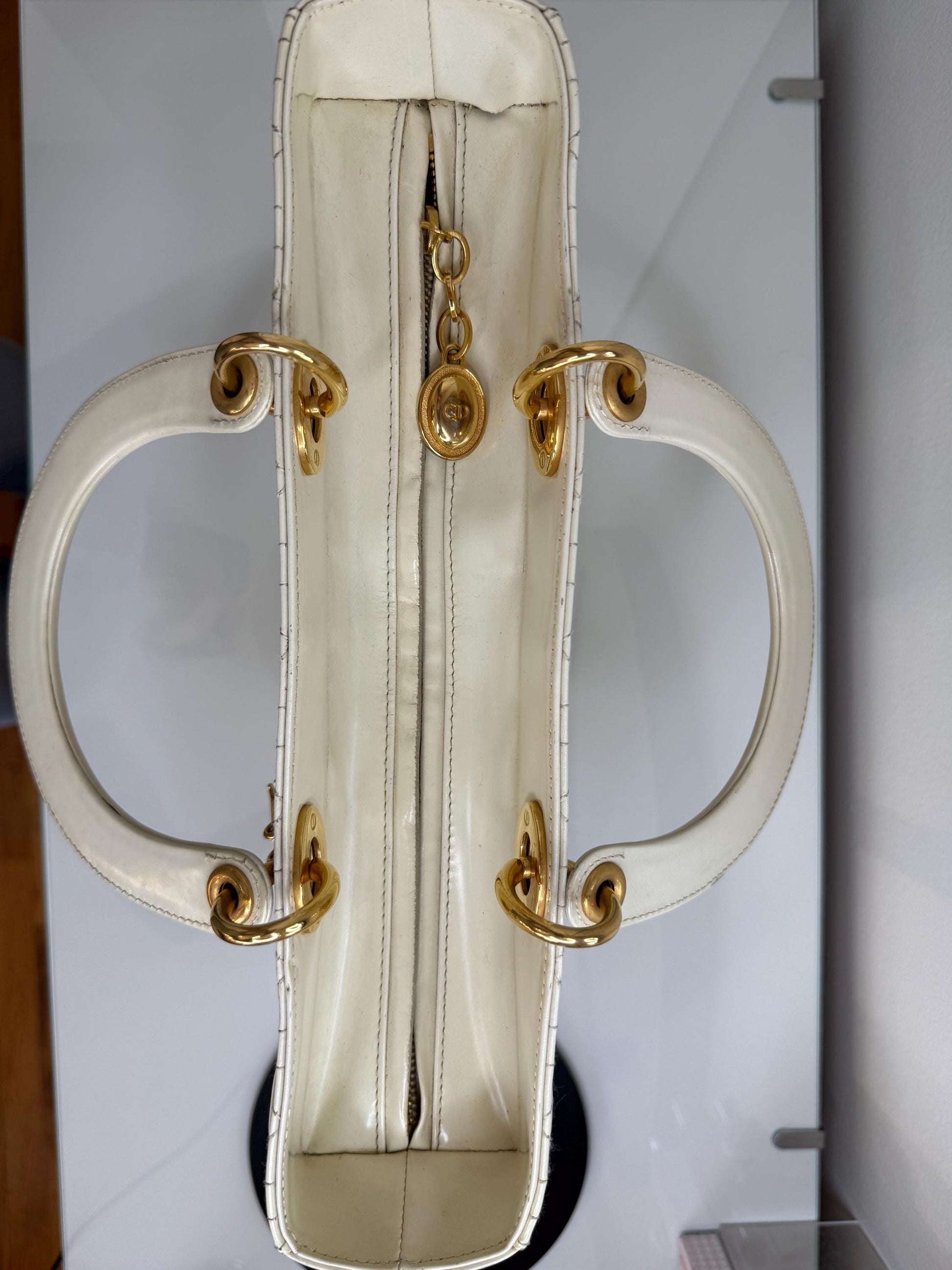 This iconic Christian Dior Lady Dior from 1999 showcases the timeless elegance of vintage haute couture. Crafted in luxurious cream patent leather, this large silhouette features the signature quilted cannage pattern and comes complete with its original shoulder strap and authentication cards. The piece displays the gentle patina of preloved luxury—minor surface scuffing on one side and base, a subtle pull near the left zipper, and subtle handle wear—all consistent with authentic vintage use. Measuring approximately 12½" × 9½" × 3", it offers generous capacity for daily sophistication. A distinguished addition for the discerning collector seeking genuine designer heritage.
