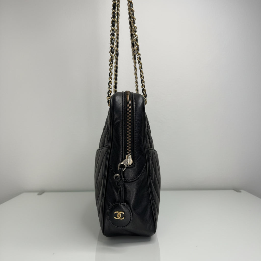 Chanel Vintage Black Lambskin Double Pocket Chevron Handbag 1986-1988