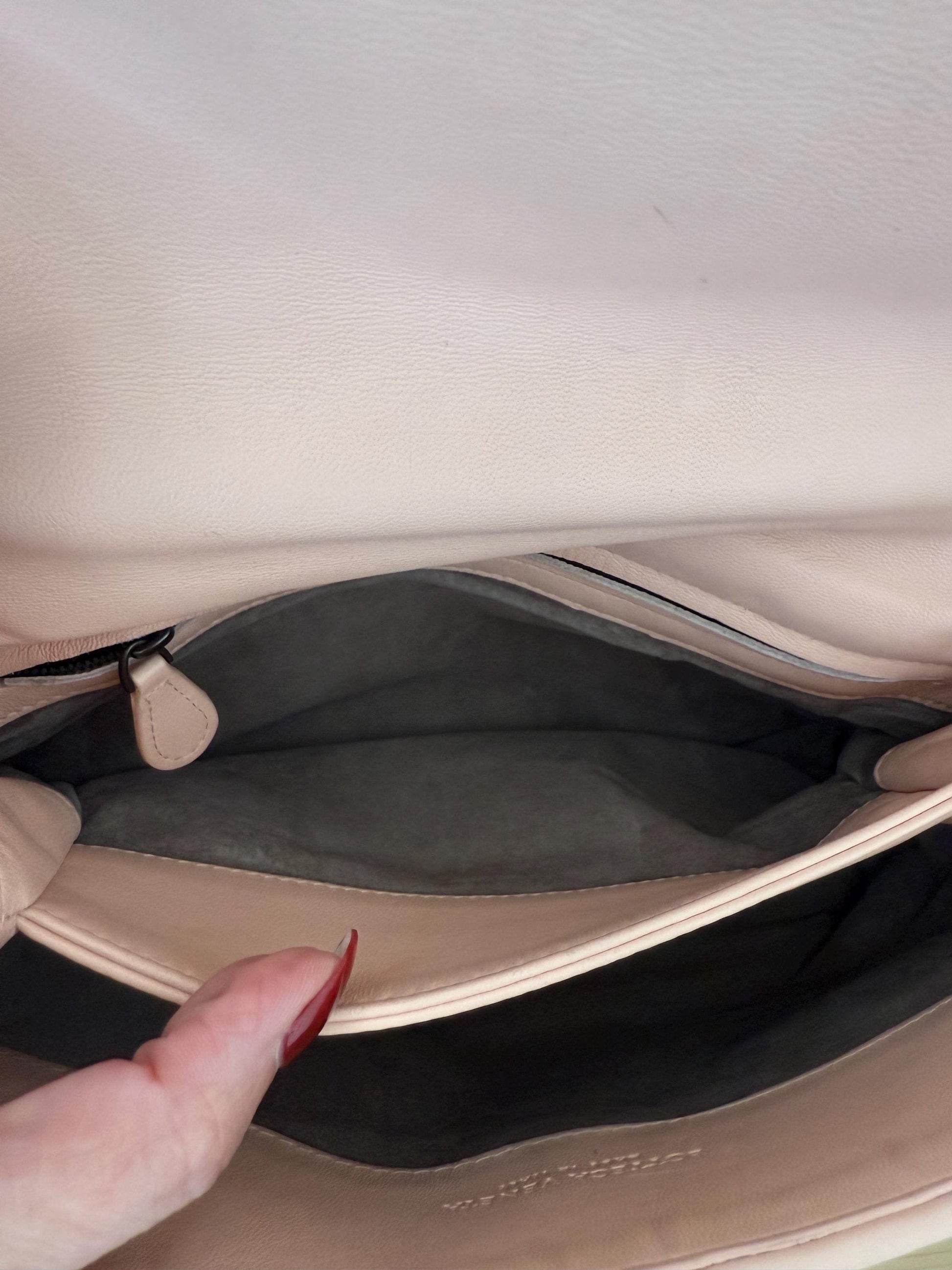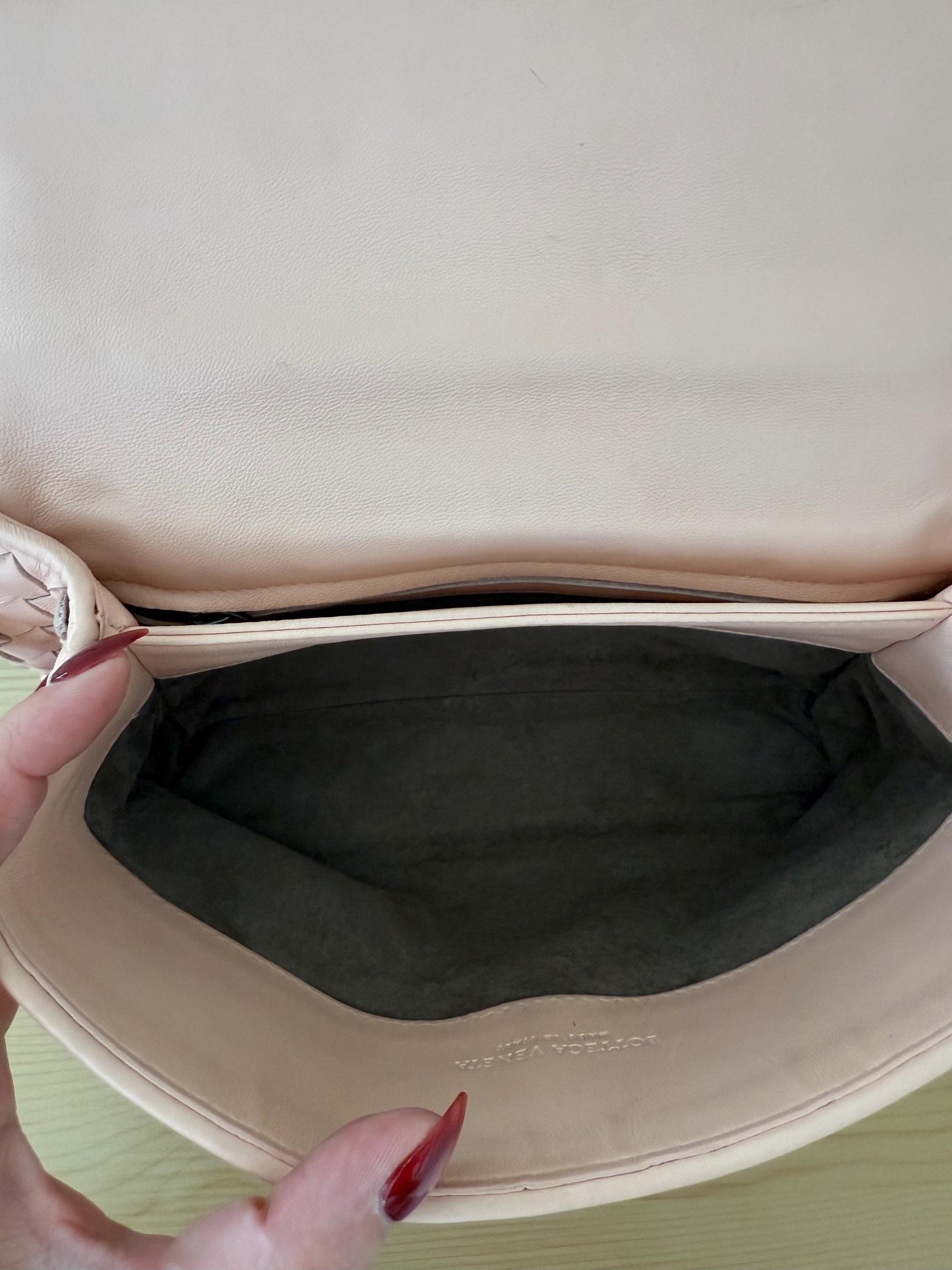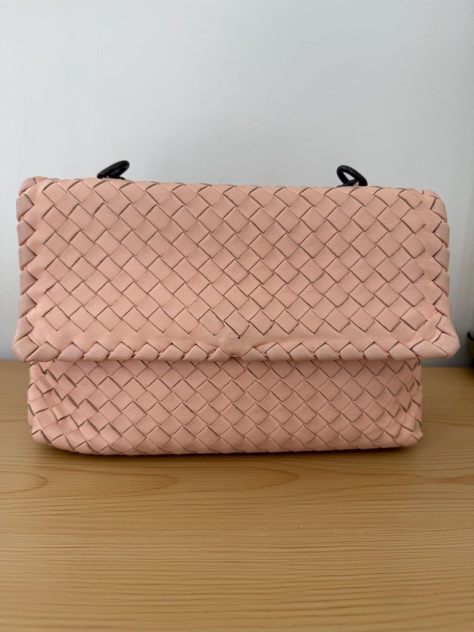 Authentic Bottega Veneta small Olimpia shoulder bag in blush pink nappa intrecciato leather. very good preloved condition.
