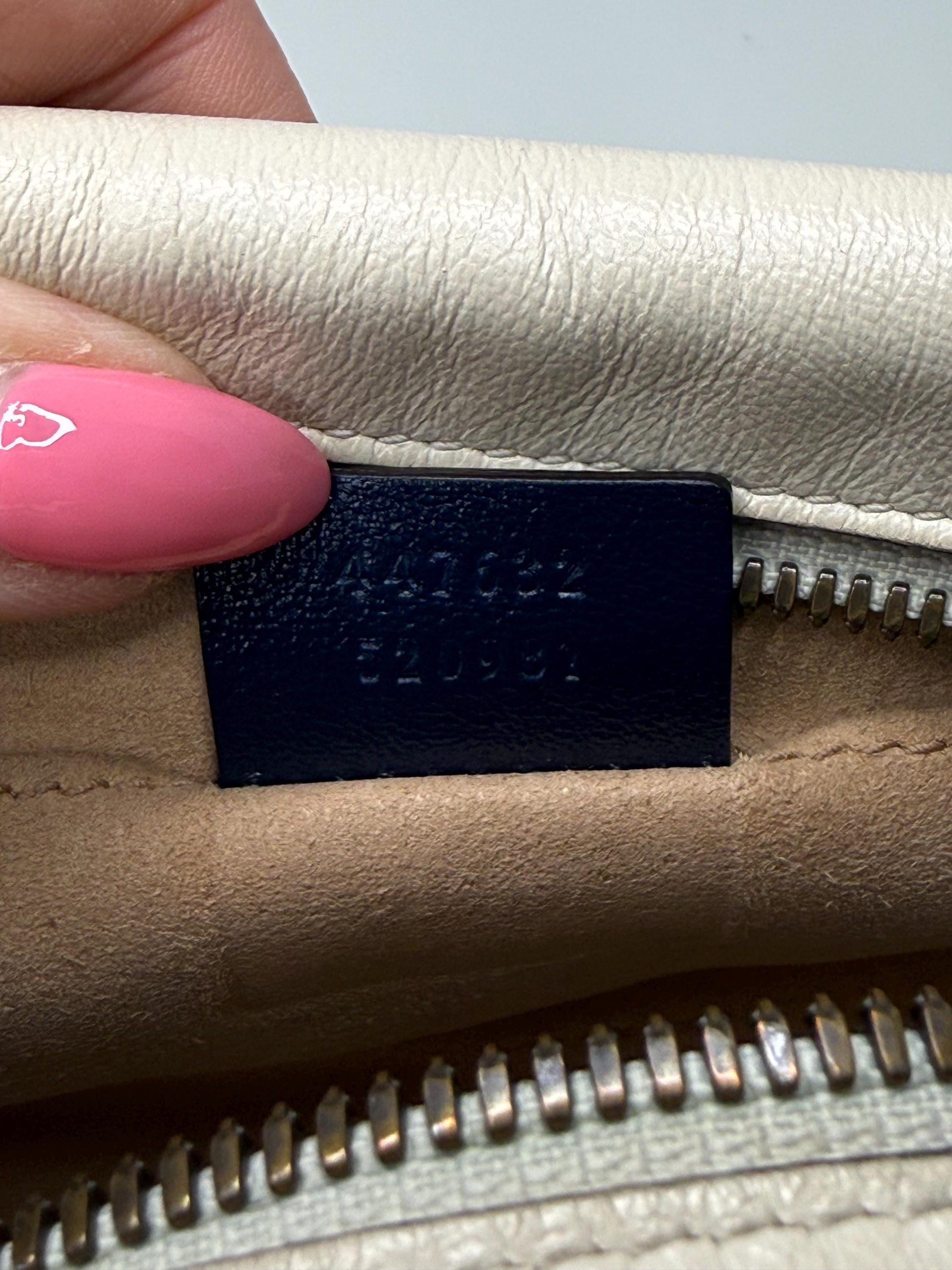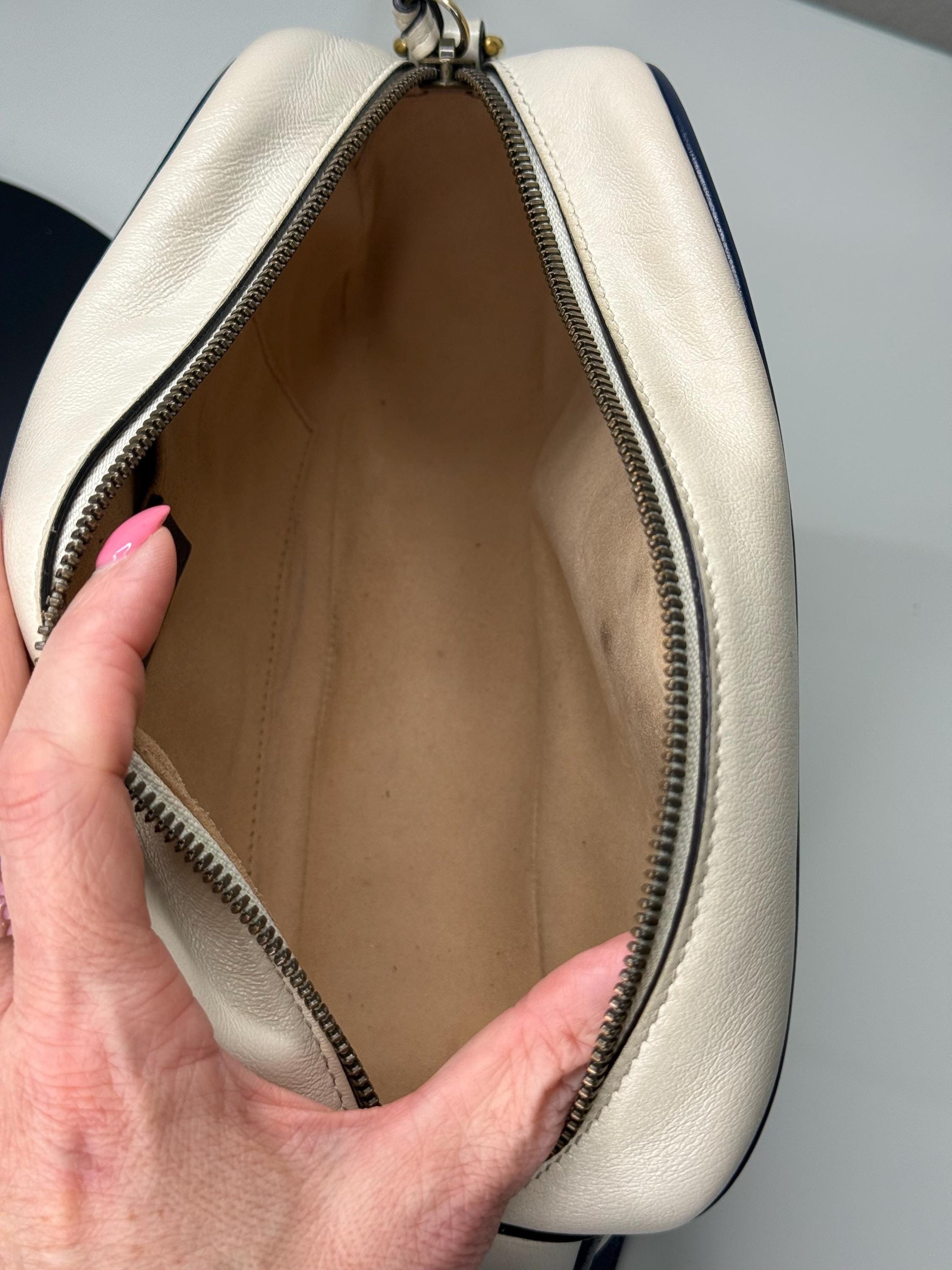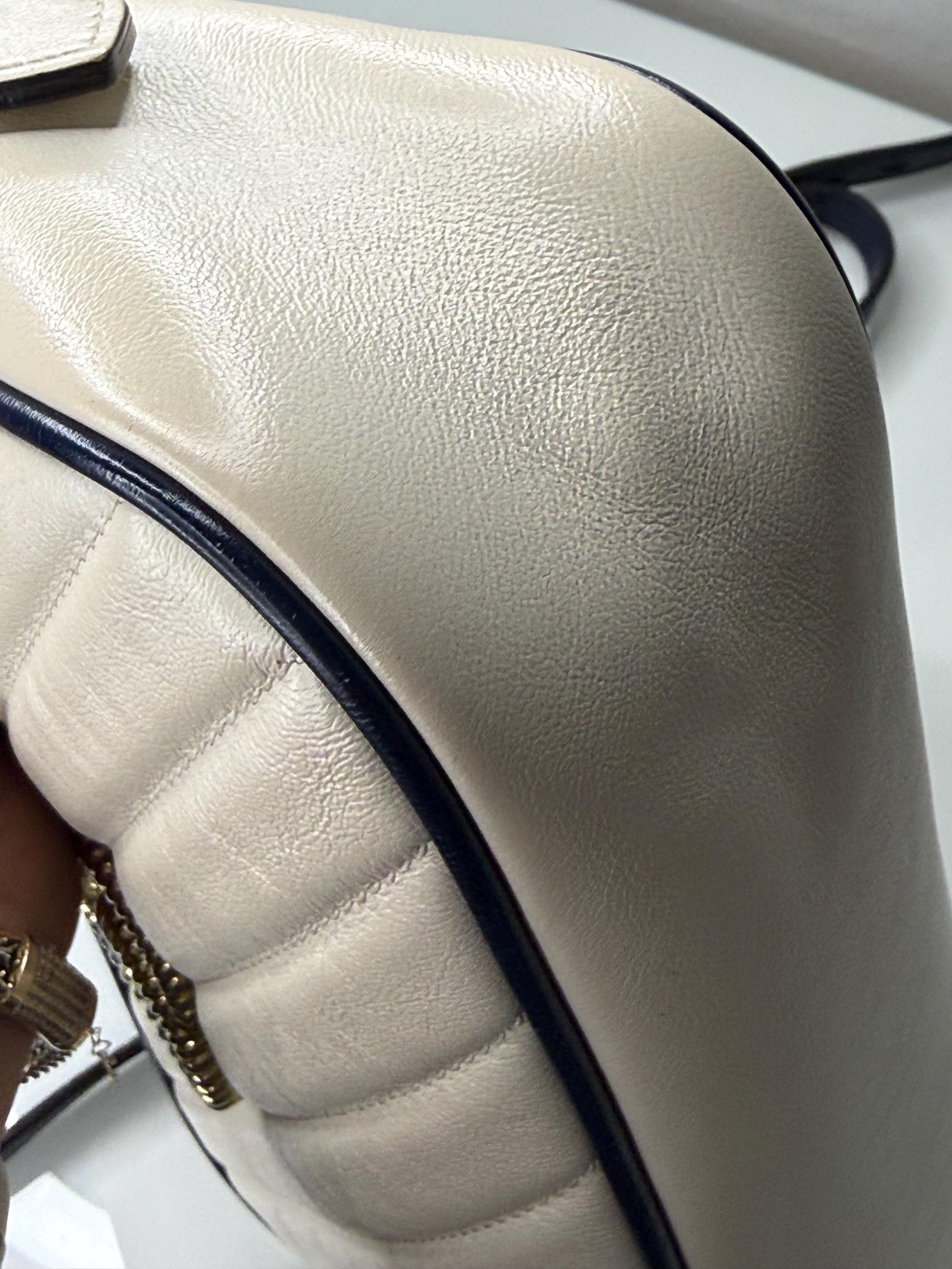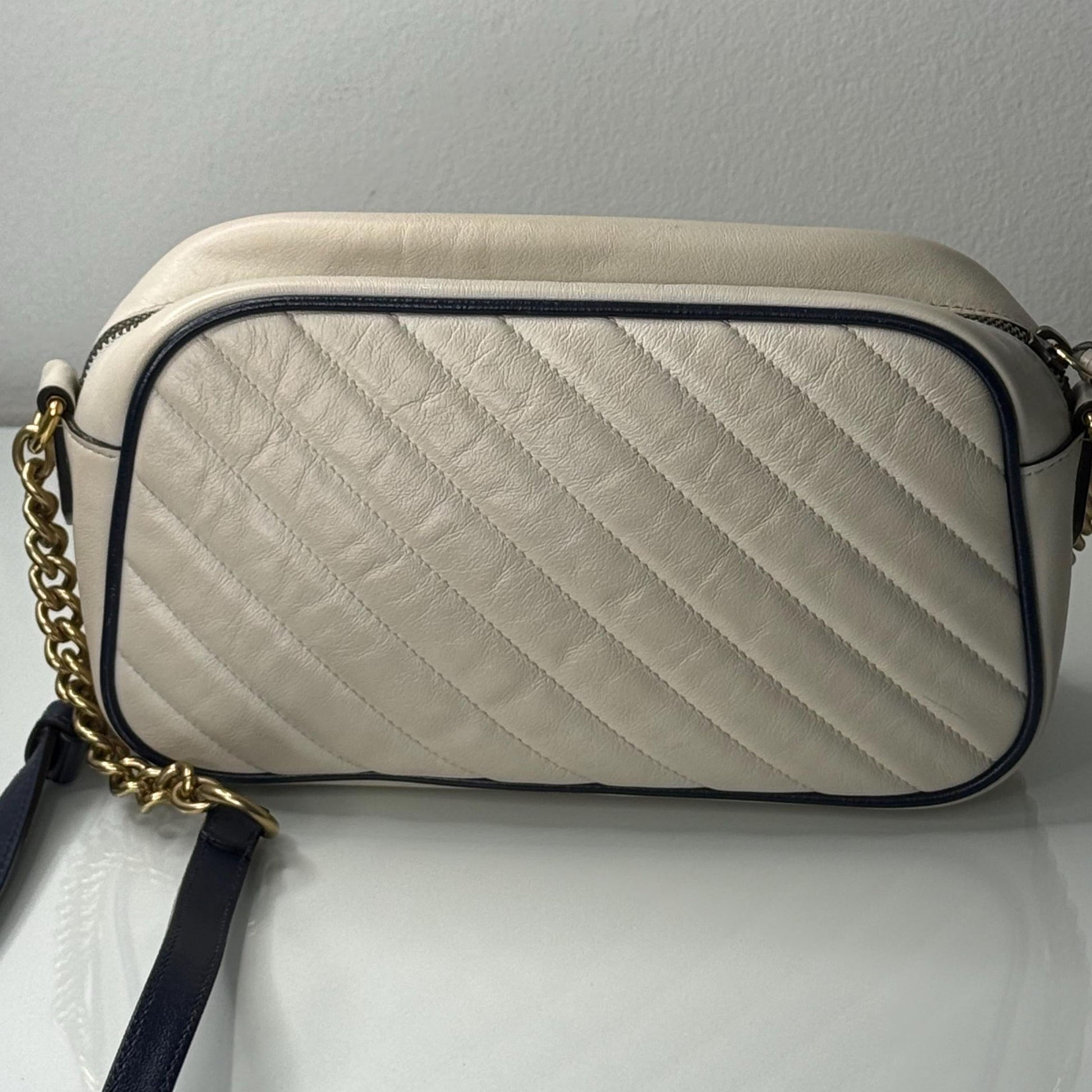 100% Authentic Gucci Vintage Effect Calfskin Matelasse Diagonal Small Torchon GG Marmont Chain Shoulder Bag Mystic White Blue Agata. In very good preloved condition. Includes dust bag. Small marking in the inside. Please reference pictures. This shoulder bag features an aged gold chain and leather shoulder strap with a textured gold Gucci GG logo on the front, soft calfskin leather in off white with a diagonal quilt and navy blue leather accents. The top zipper opens to a beige fabric interior with a patch pocket.